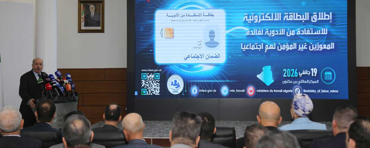 تنفيذا لأحكام المرسوم التنفيذي رقم 24-287 المؤرخ في 22 أوت 2024، المحدد لكيفيات التكفل الطبي بالمعوزين غير المؤمن لهم اجتماعيا، أشرف السيد وزير العمل والتشغيل والضمان الاجتماعي، الأستاذ عبد الحق سايحي رفقة وزيرة التضامن الوطني والأسرة وقضايا المرأة السيدة صورية مولوجي اليوم 19 جانفي 2026 على مراسم إطلاق البطاقة الإلكترونية للاستفادة من الأدوية لفائدة المعوزين غير المؤمن لهم اجتماعيا، بحضور إطارات القطاعين.